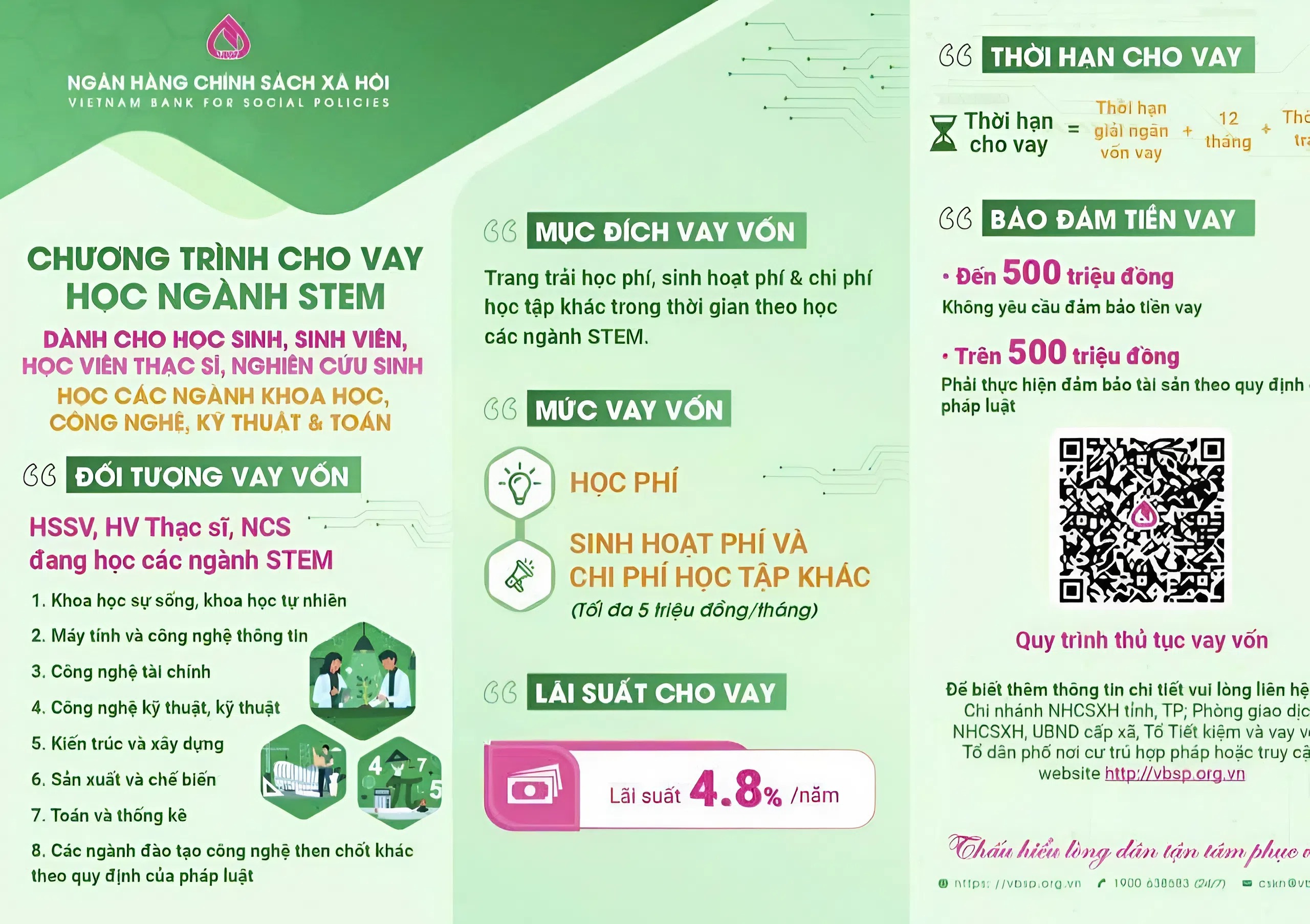 Thực hiện Quyết định số 29/2025/QĐ-TTg của Thủ tướng Chính phủ về tín dụng đối với học sinh, sinh viên (HSSV), học viên Thạc sĩ, nghiên cứu sinh học các ngành khoa học, công nghệ, kỹ thuật và toán (STEM) để trang trải học phí, sinh hoạt phí và chi phí học tập khác trong thời gian học; sự chỉ đạo của Ngân hàng chính sách xã hội Việt Nam, Ngân hàng Chính sách xã hội chi nhánh tỉnh Đồng Nai, Phòng Giao dịch Ngân hàng Chính sách xã hội Định Quán thực hiện triển khai chương trình cho vay đảm bảo kịp thời, đúng đối tượng như sau: