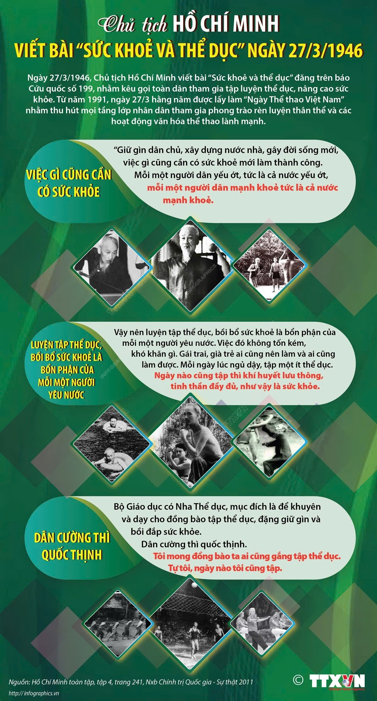 Bác viết: "Mỗi một người dân yếu ớt, tức là cả nước yếu ớt, mỗi một người dân mạnh khỏe tức là cả nước mạnh khỏe”. Bác kêu gọi mọi người dân bất kể già trẻ, trai gái ra sức luyện tập thể dục hằng ngày để có sức khỏe, đồng thời Bác cũng khẳng định rằng: Luyện tập thể dục, bồi bổ sức khỏe là bổn phận của mỗi một người yêu nước. Mỗi người dân mạnh khỏe tức là cả nước mạnh khỏe, có như vậy, công cuộc kháng chiến mới thắng lợi, kiến quốc mới thành công.